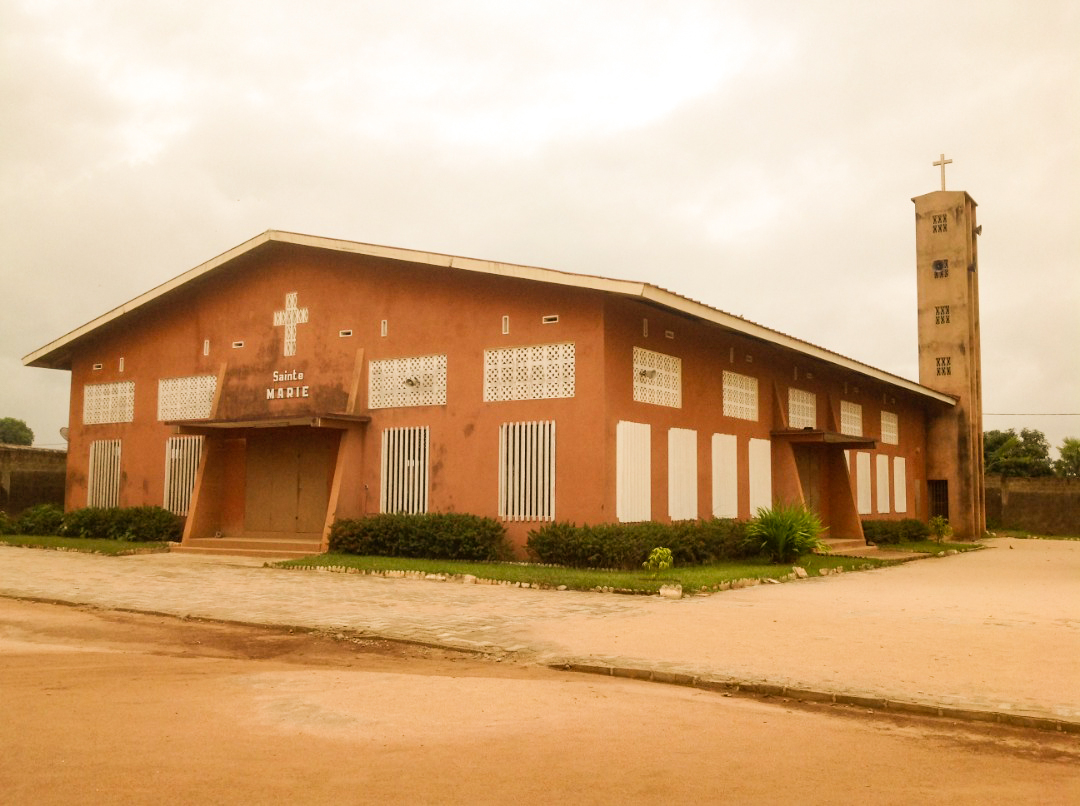 1991, dimanche 20 janvier. Le Père RANCHIN bénit les fondations de la nouvelle église. Le travail avance vite. Mais, le 30 mars, une terrible tornade s’abat sur Bouaké. Les murs, encore mal assurés, s’écroulent. Pas de découragement. Le Père repense le plan initial et prévoit des contreforts. Des proches apporteront une note de gaieté. Le 2 avril, les travaux reprennent. Tout ira très vite. Le 1er août, pose de la toiture, en septembre, les carreaux, en octobre, les portes, la peinture, l’installation de la cloche (80 kilos). L’église est inaugurée le 17 novembre 91, et placée sous le vocable de Sainte Marie.